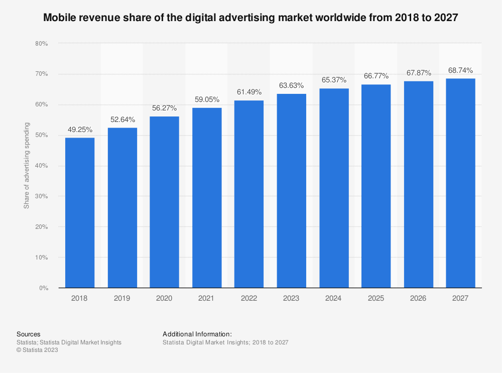 2018年至2027年全球数字广告市场的移动收入份额。数据来源:Statista.com