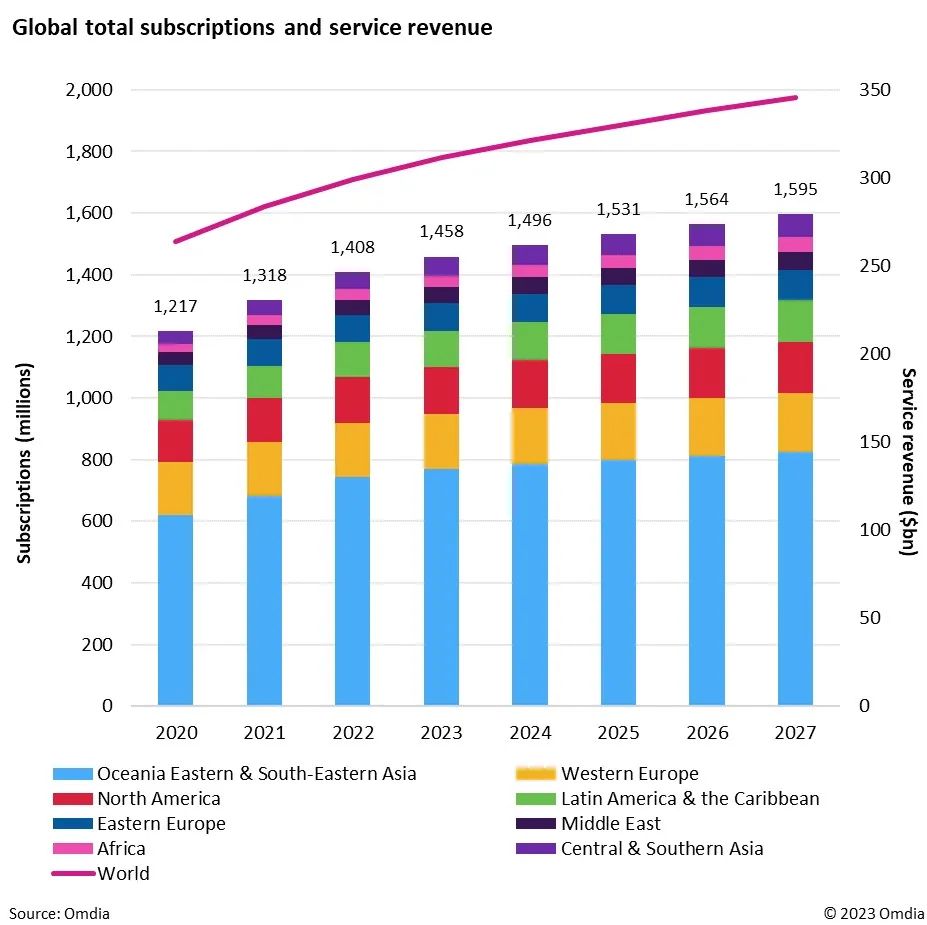 服务收入的增长幅度不及用户增长幅度—政府支持的救助方案、货币贬值以及更大的财政不确定性导致服务收入在2022年仅增长5.4%。Omdia预计,从2023年开始,服务收入的增长速度将与用户增长速度持平。