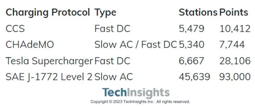 - 然而,其他OEM车厂也有可能逐渐开始采用NACS规格,因为NACS比CCS更有优势:1. 使用相同的端口进行慢速交流和快速直流充电,插头更小更轻;2. 拥有更小的充电器,更高效的电源开关电源电子设备,有助于降低安装成本;3. 改善的用户体验;4. 特斯拉超级充电站网络比使用CCS的竞争对手更广泛的快速充电可用性(见下表)。