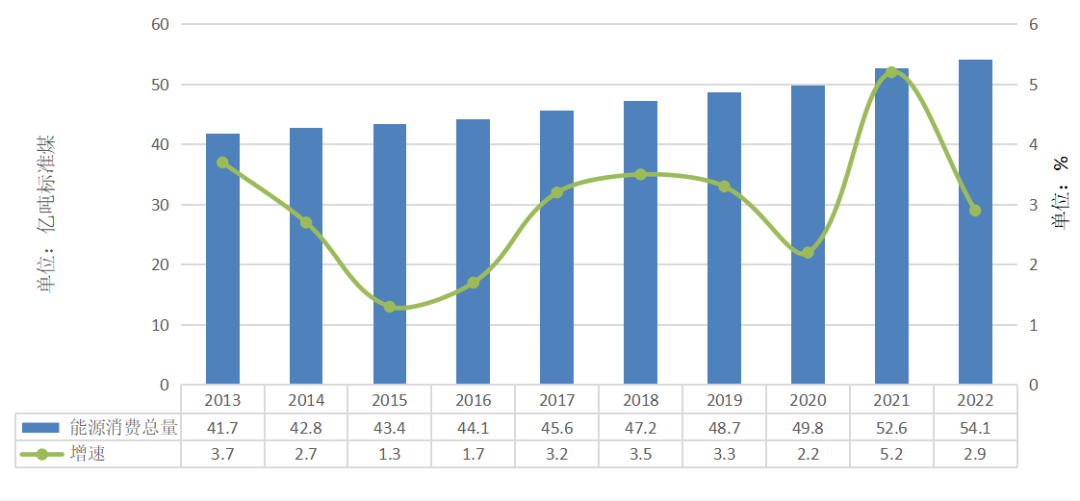 初步核算,2022年全国能源消费总量54.1亿吨标准煤,比上年增长2.9%。煤炭消费量增长4.3%,原油消费量下降3.1%,天然气消费量下降1.2%,电力消费量增长3.6%。煤炭消费量占能源消费总量的56.2%,比上年上升0.3个百分点;天然气、水电、核电、风电、太阳能发电等清洁能源消费量占能源消费总量的25.9%,上升0.4个百分点。2013年以来,我国能源消费总量处于低速增长态势,以较低的能源消费增速支撑着经济的中高速发展。