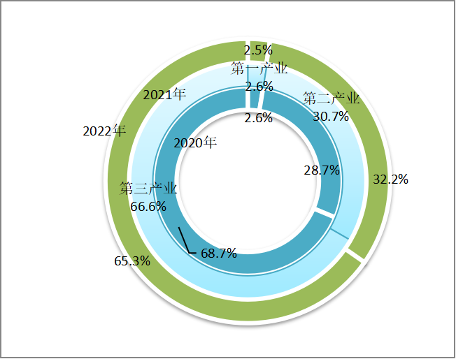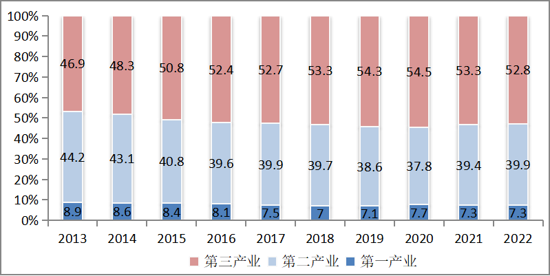 从占比看,2022年第一产业增加值占国内生产总值比重为7.3%,与上年持平;第二产业增加值比重为39.9%,较上年增加0.5个百分点;第三产业增加值比重为52.8%,较上年减少0.5个百分点。