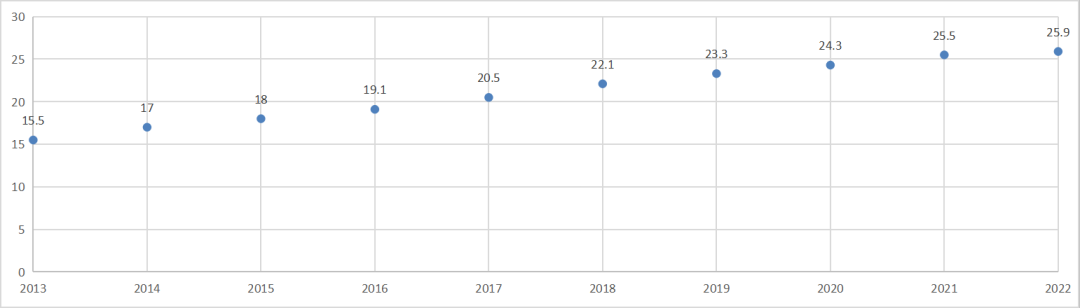 图1-12 2013—2022年清洁能源消费占能源消费总量的比重