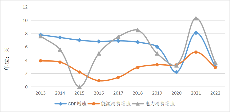 图1-10 2013—2022年国内生产总值增速、能源消费增速、电力消费增速对比