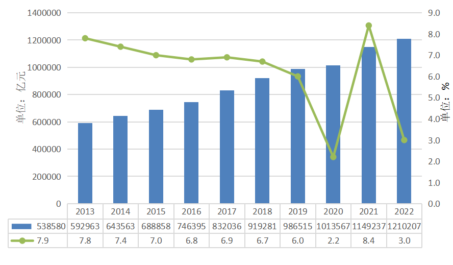 图1-1 2013—2022年国内生产总值及增速