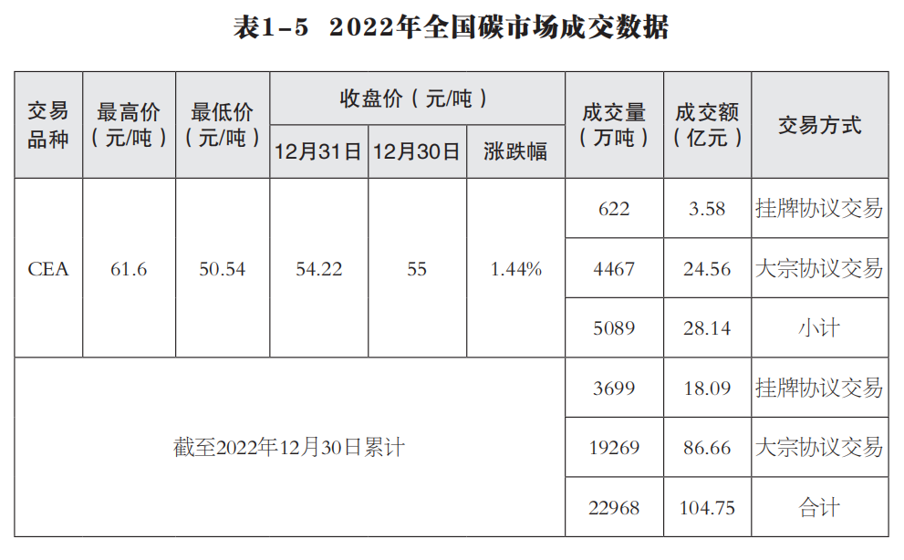 2022年,国家相关部门出台系列政策,碳市场建设不断完善。4月,《中共中央 国务院关于加快建设全国统一大市场的意见》中提出建设全国统一的能源市场以及培育发展全国统一的生态环境市场。6月,生态环境部等17部门联合印发《国家适应气候变化战略2035》,生态环境部等7部门印发《减污降碳协同增效实施方案》。8月,科技部等9部门印发《科技支撑碳达峰碳中和实施方案(2022—2030年)》,国家发展改革委、国家统计局、生态环境部联合印发《关于加快建立统一规范的碳排放统计核算体系实施方案》。10月,国家能源局印发《能源碳达峰碳中和标准化提升行动计划》,市场监管总局等9部门联合印发《建立健全碳达峰碳中和标准计量体系实施方案》。12月,生态环境部办公厅印发《企业温室气体排放核算方法与报告指南 发电设施》《企业温室气体排放核查技术指南 发电设施》。2022年,全国碳市场迈入第二个履约周期,总体运行平稳,碳价较2021年有所上涨。全年共运行50周(242个交易日),全国碳市场碳排放配额(CEA)年度成交量5088.95万吨,年度成交额28.14亿元。截至2022年12月31日,CEA累计成交量2.30亿吨,累计成交额104.75亿元。每日收盘价在55~62元/吨之间波动,成交均价为45.61元/吨。