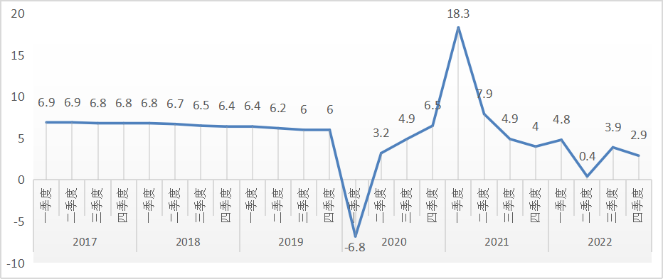 从季度走势看,2022年我国经济恢复几经波折。一季度国内生产总值同比增长4.8%,增速表现与市场预期基本相符;二季度在疫情、乌克兰危机等因素影响下,国内生产总值增速降至0.4%,为2020年二季度以来最低;三季度国内生产总值增速回升至3.9%;四季度国内生产总值增速再度回落至2.9%。