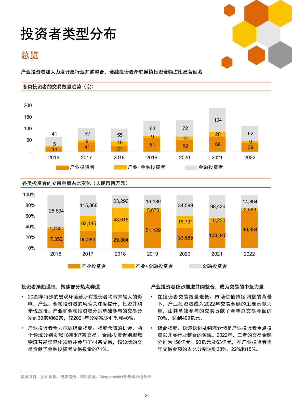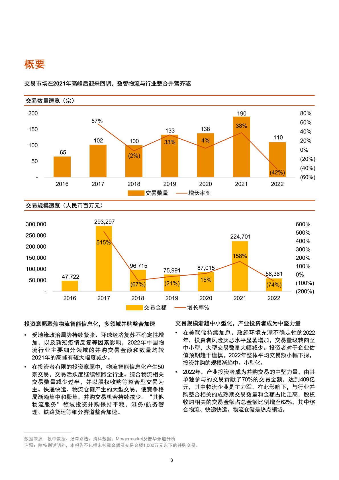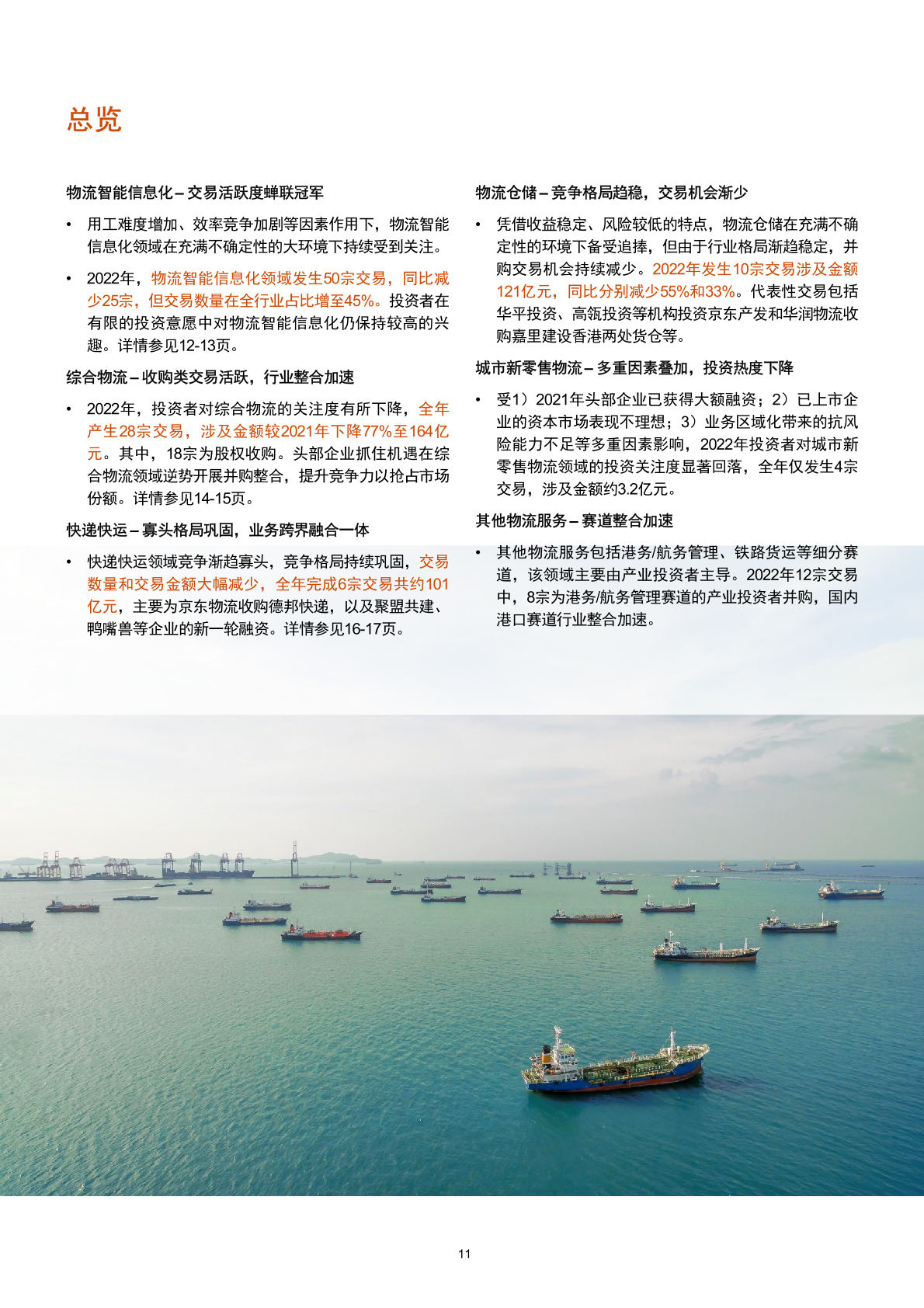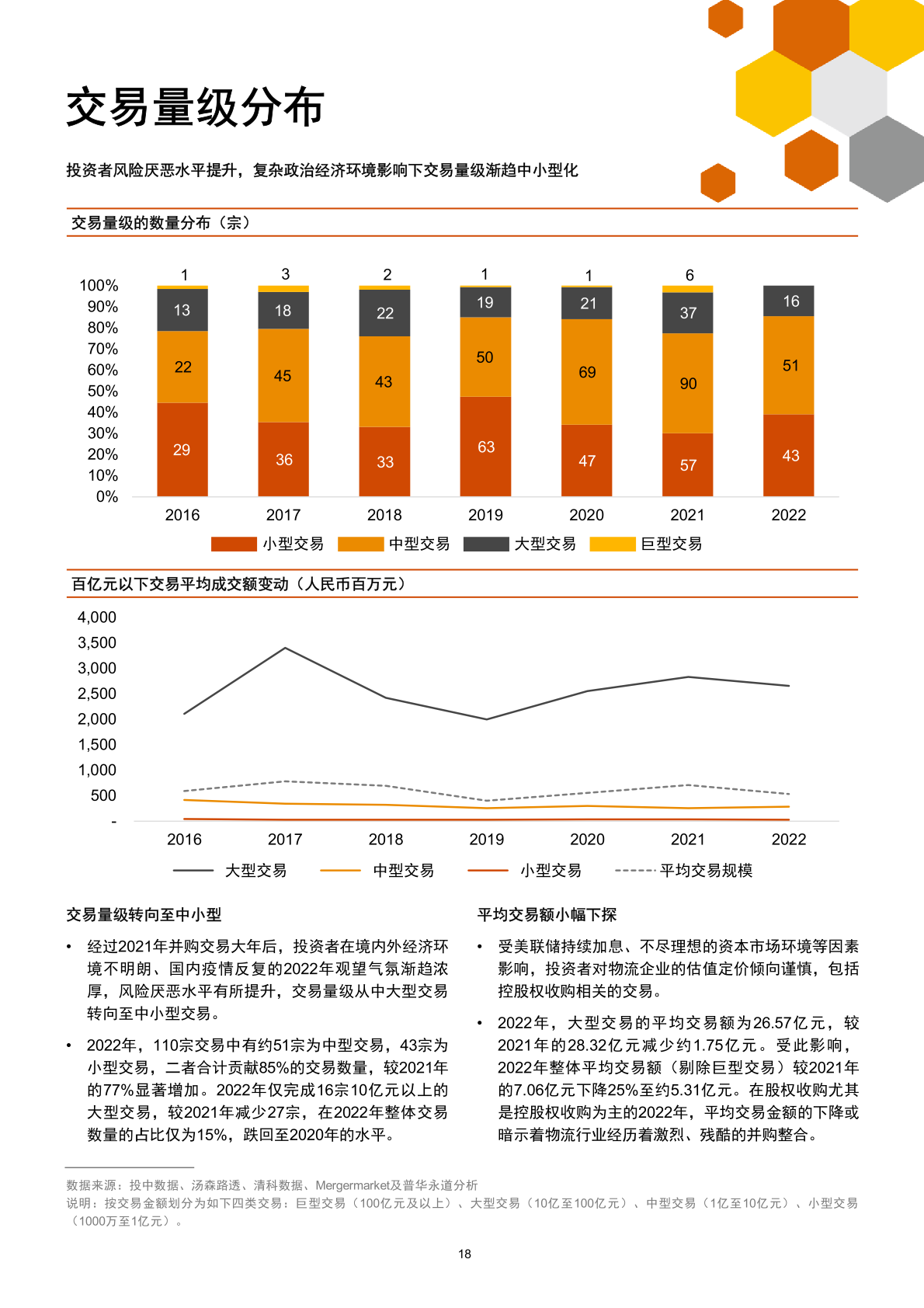 受复杂多变的环球政治、经济及新冠疫情等因素影响,2022年中国物流行业并购交易市场迎来回调。全年共发生110宗并购交易,同比减少80宗,交易数量跌回至2019年以前的水平;交易规模较2021年下降74%至584亿元。投资者决策渐趋谨慎,交易量级渐趋中小型化,主要交易轮次的平均交易额亦出现不同程度的回落。