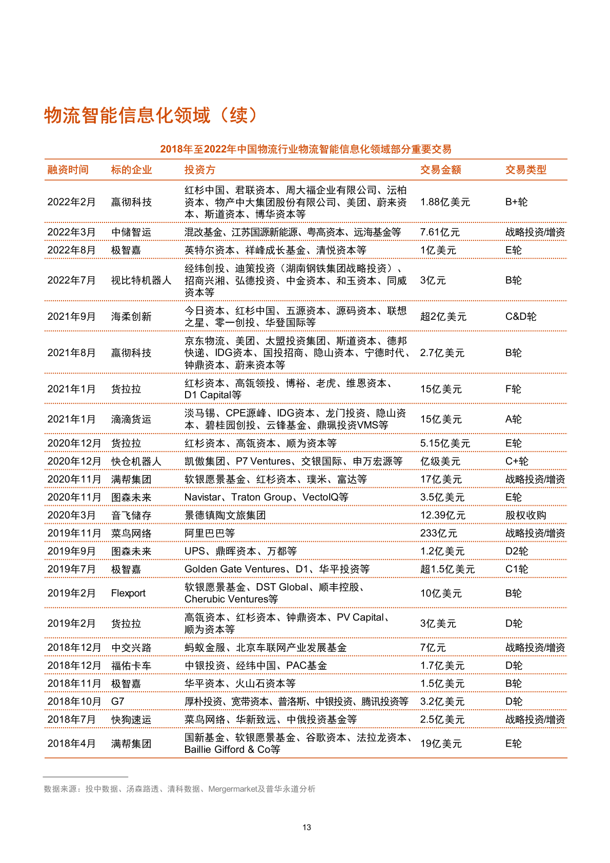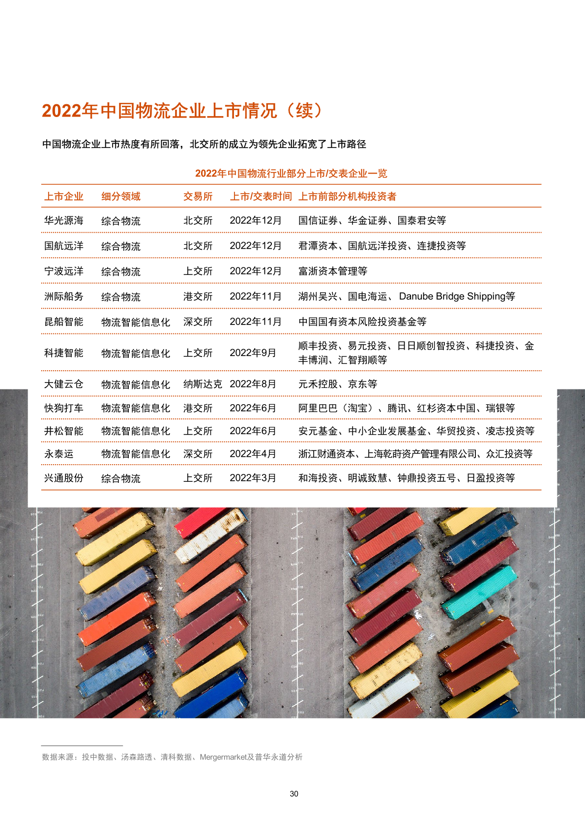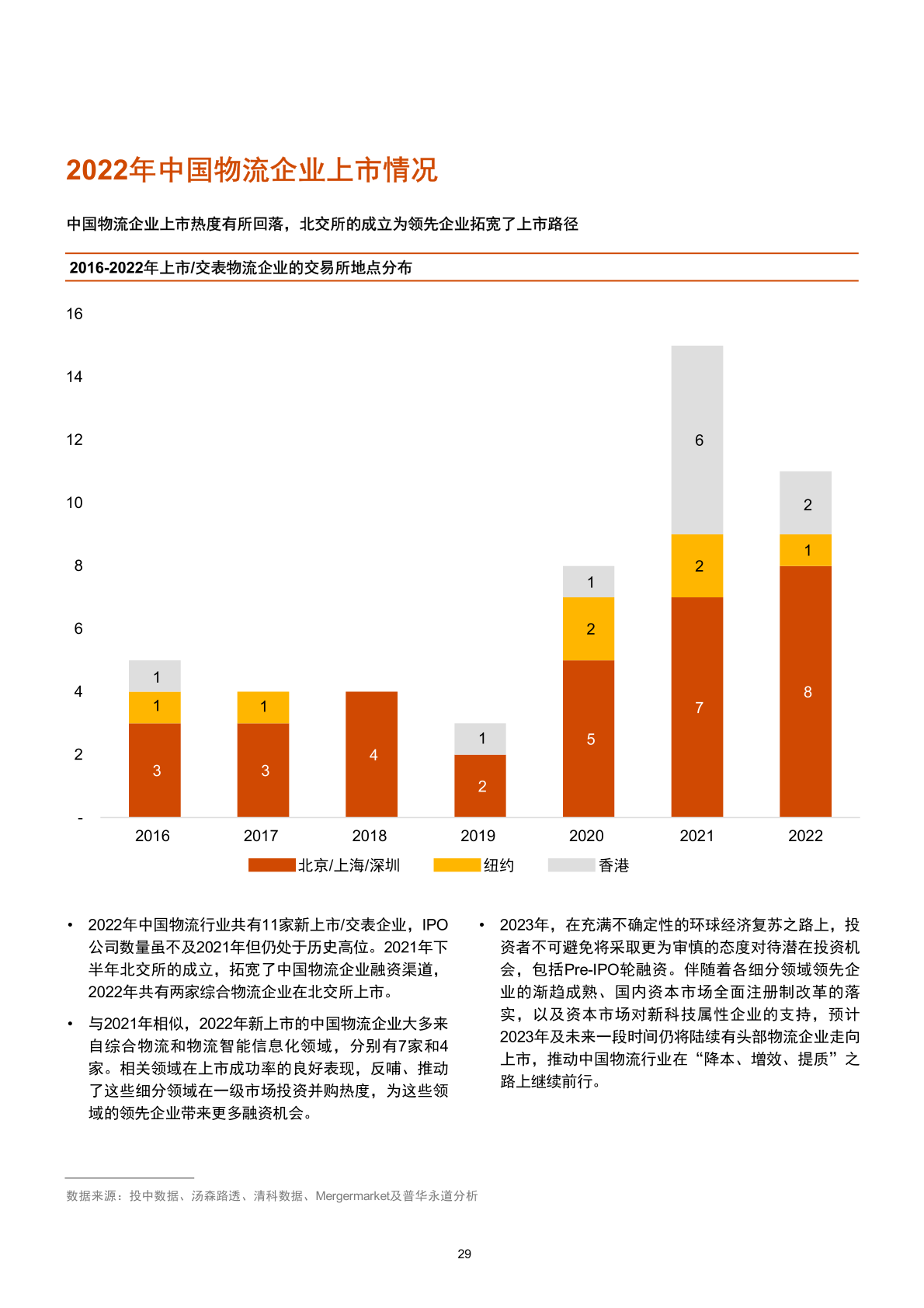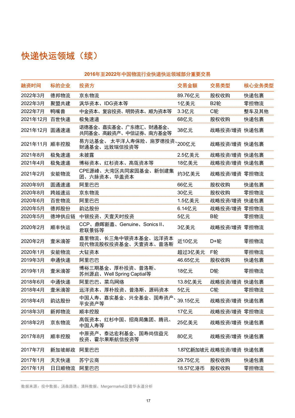 受复杂多变的环球政治、经济及新冠疫情等因素影响,2022年中国物流行业并购交易市场迎来回调。全年共发生110宗并购交易,同比减少80宗,交易数量跌回至2019年以前的水平;交易规模较2021年下降74%至584亿元。投资者决策渐趋谨慎,交易量级渐趋中小型化,主要交易轮次的平均交易额亦出现不同程度的回落。