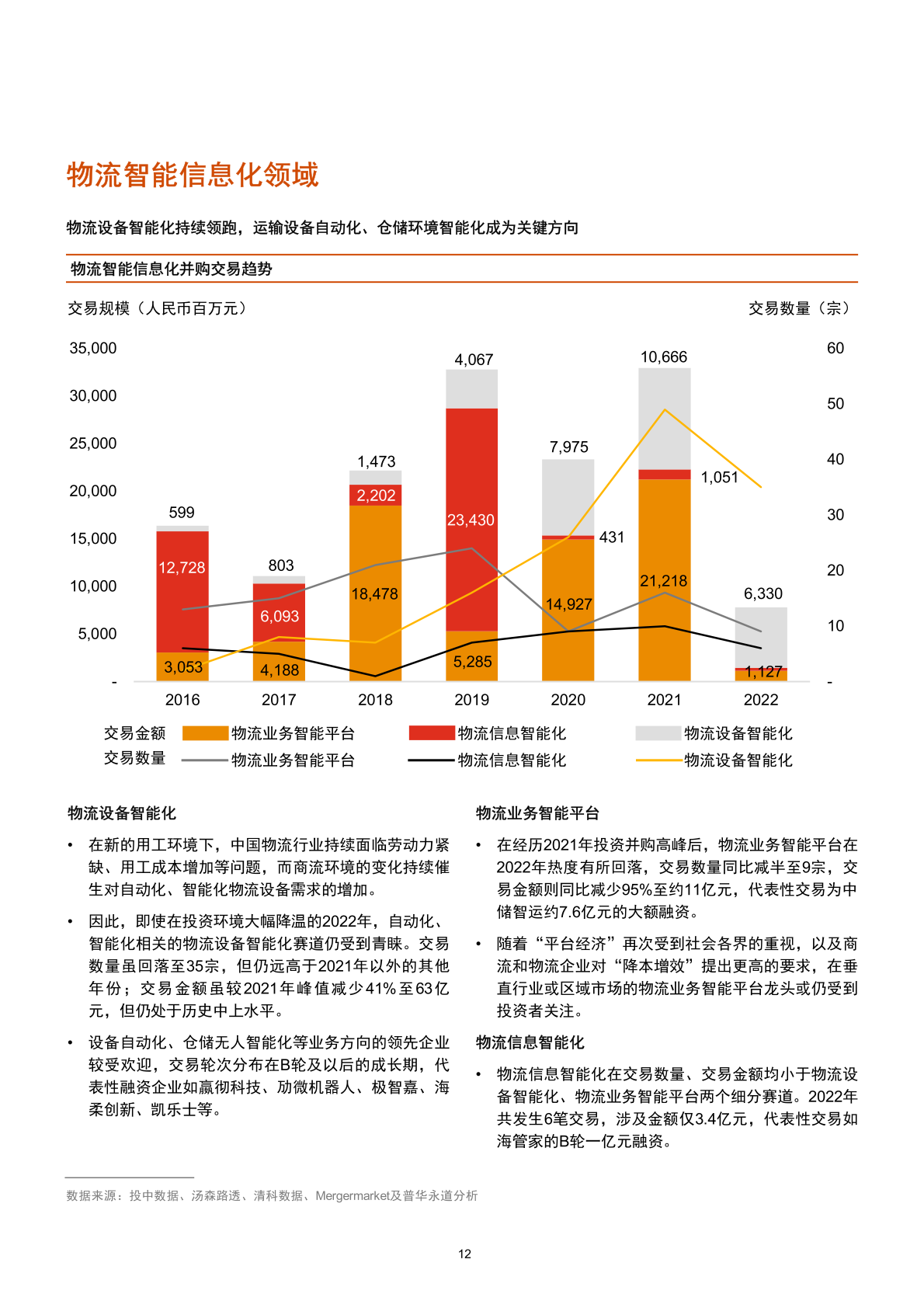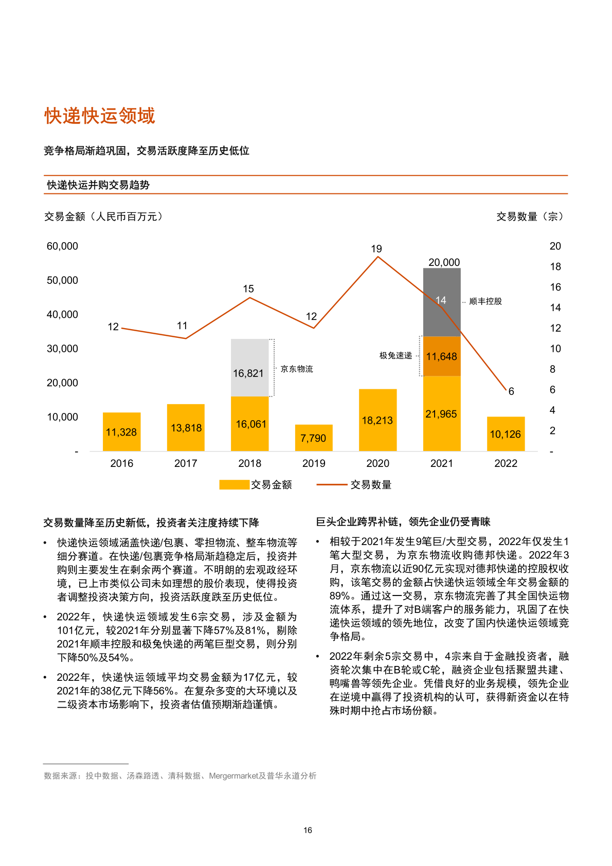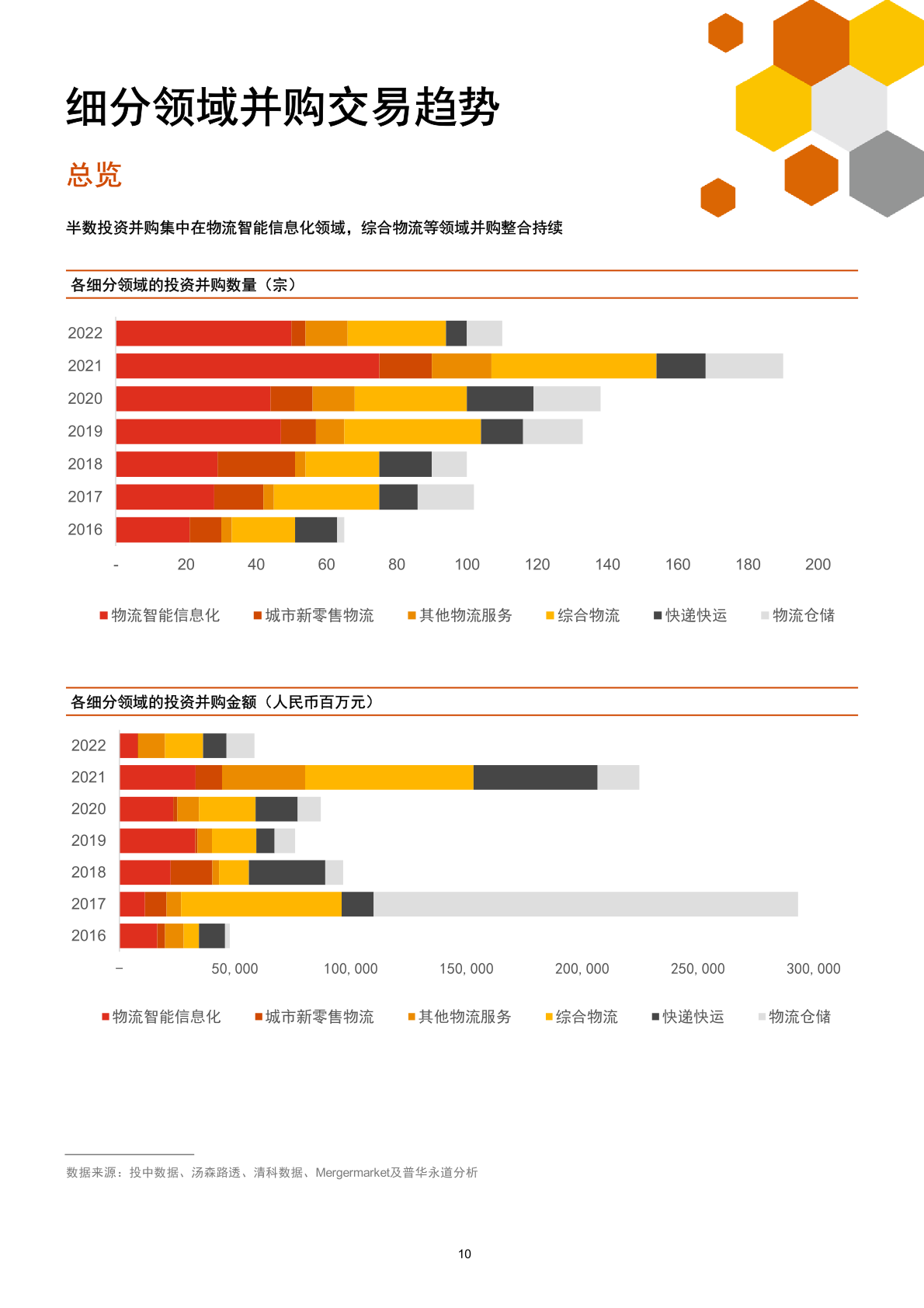 按细分领域来看,物流智能信息化交易活跃度继续领跑全行业,全年产生50宗交易;综合物流领域交易数量减少过半,行业整合型交易成为主轴;而快递快运、物流仓储产生了若干影响行业格局的重要交易,寡头竞争加剧; “其他物流服务” 领域投资并购保持平稳,港务/航务管理、铁路货运等细分赛道整合加速。