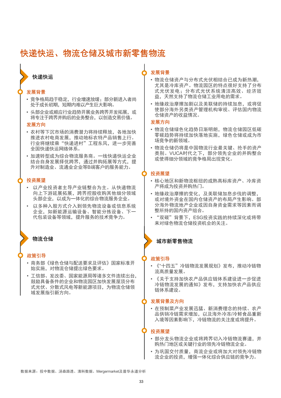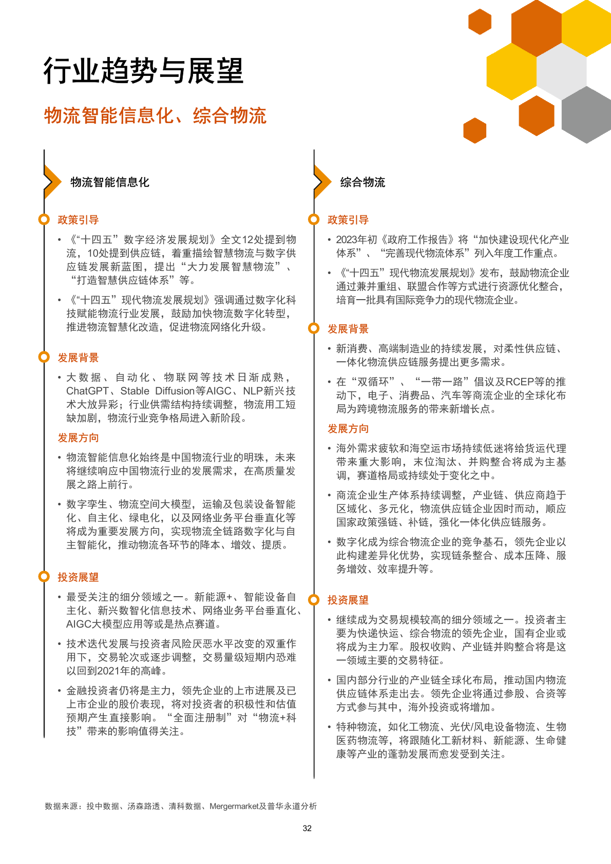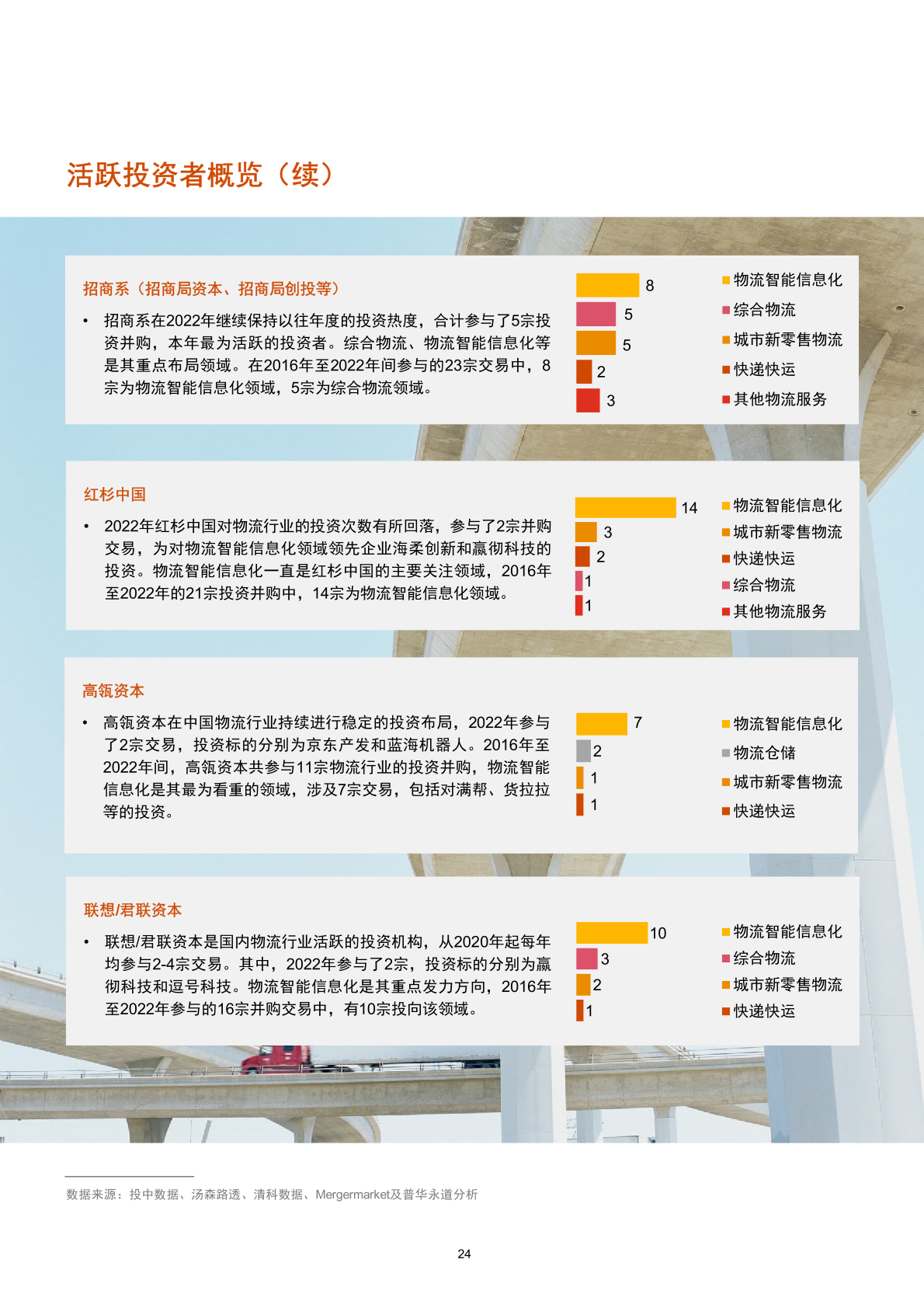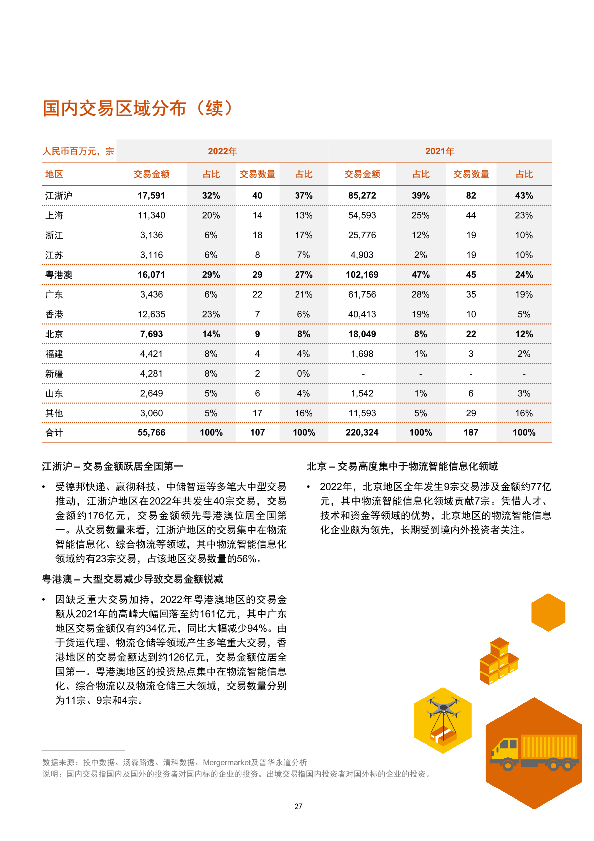 按细分领域来看,物流智能信息化交易活跃度继续领跑全行业,全年产生50宗交易;综合物流领域交易数量减少过半,行业整合型交易成为主轴;而快递快运、物流仓储产生了若干影响行业格局的重要交易,寡头竞争加剧; “其他物流服务” 领域投资并购保持平稳,港务/航务管理、铁路货运等细分赛道整合加速。