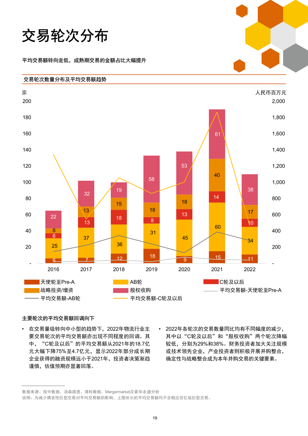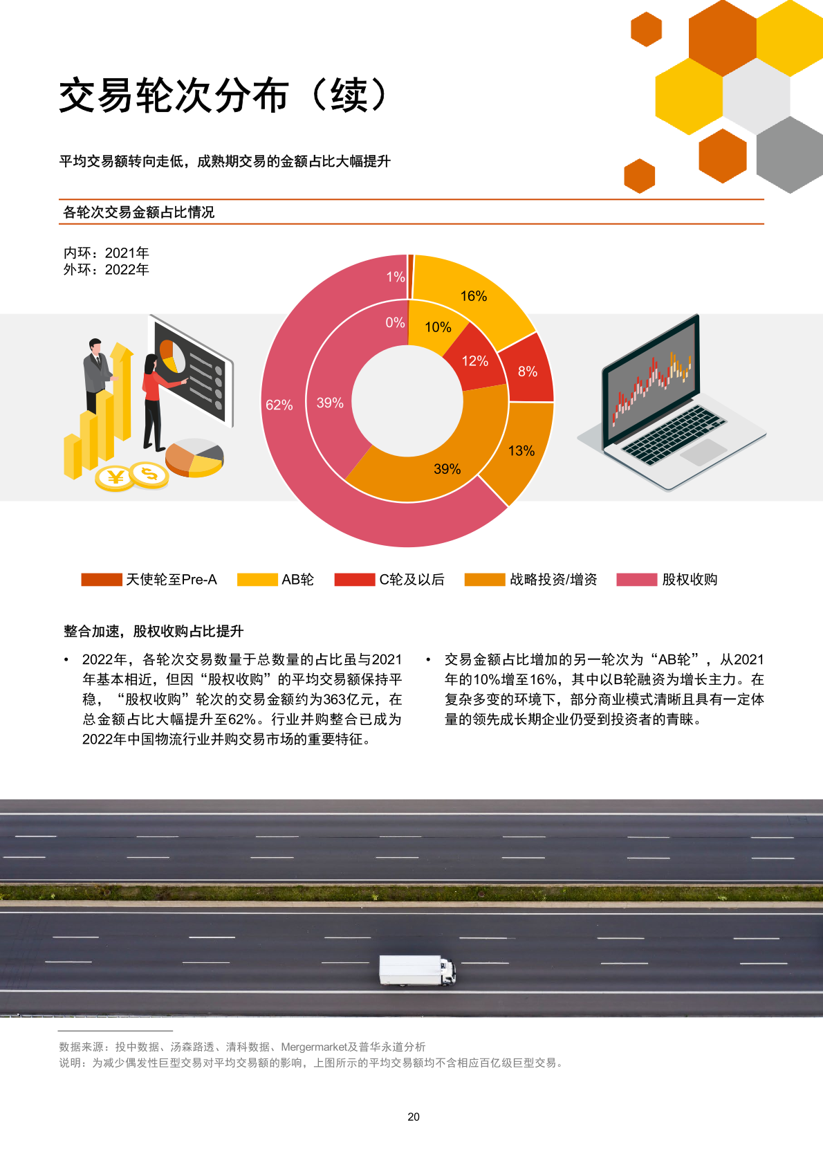 受复杂多变的环球政治、经济及新冠疫情等因素影响,2022年中国物流行业并购交易市场迎来回调。全年共发生110宗并购交易,同比减少80宗,交易数量跌回至2019年以前的水平;交易规模较2021年下降74%至584亿元。投资者决策渐趋谨慎,交易量级渐趋中小型化,主要交易轮次的平均交易额亦出现不同程度的回落。