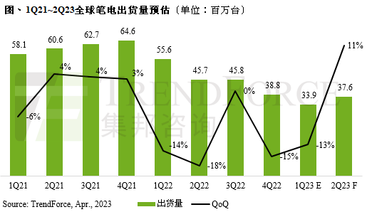 据TrendForce集邦咨询研究显示,2023年第一季全球笔电出货量约3,390万台,季减13%、年减39%,主要是经济疲软持续影响消费市场信心,拖累渠道笔电整机去化进度,也进一步促使品牌调降代工厂订单,以有效调节库存压力。第二季在笔电整机及零组件库存压力将会缓解的预期下,渠道回补需求可望逐月增强,同时带动第二季笔电出货量提升至3,763万台,季增11%,但仍较去年同期衰退18%。